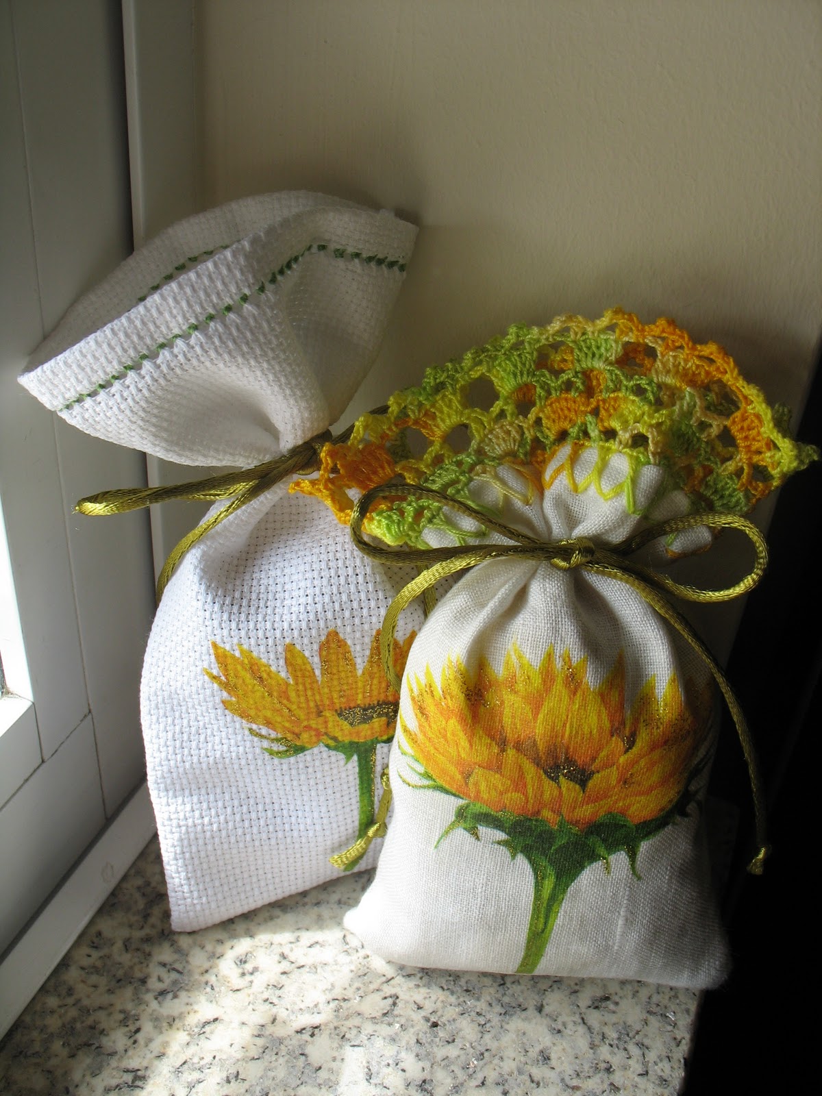 Um em quadrilé com ponto ajour, o outro em algodão com remate em croché.